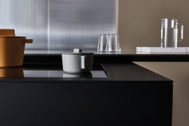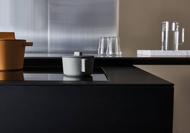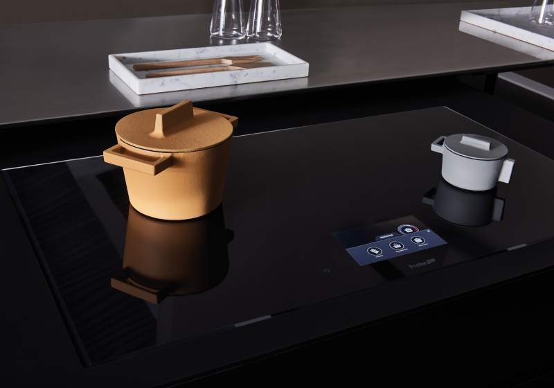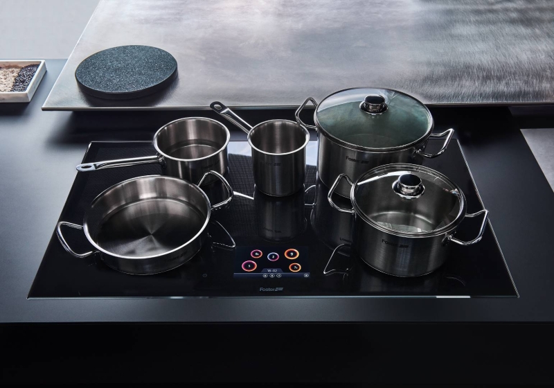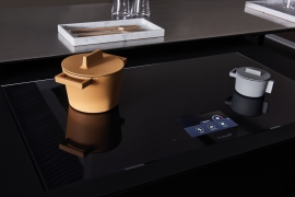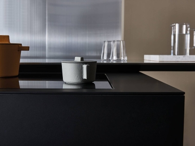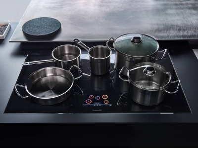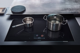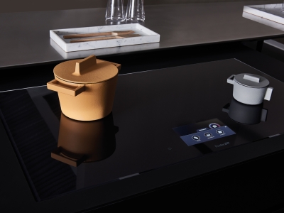 - Индукционная плита с полной поверхностью определяет положение и размер кастрюли и автоматически активирует соответствующие элементы управления на дисплее — можно свободно разместить до 6 кастрюль.